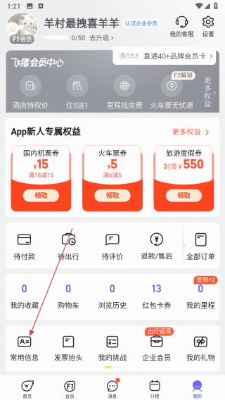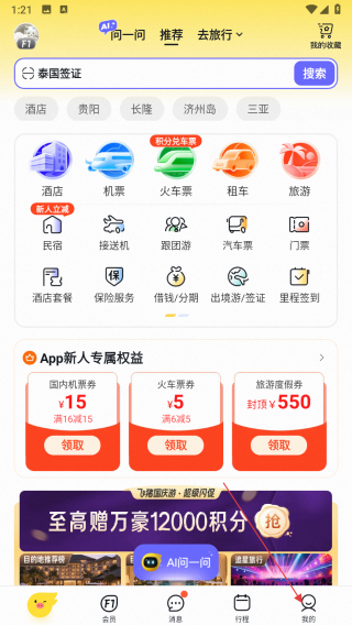 1、打開飛豬旅行APP,點擊底部導(dǎo)航欄我的,進入個人頁面。