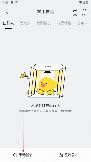 3、在常用信息界面的出行人標(biāo)簽頁下,點擊底部手動新增按鈕,進入新增出行人頁面。