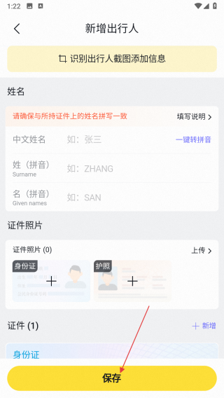 4、在新增出行人頁面,填寫姓名、證件等信息,完成后點擊保存,即可添加出行人。