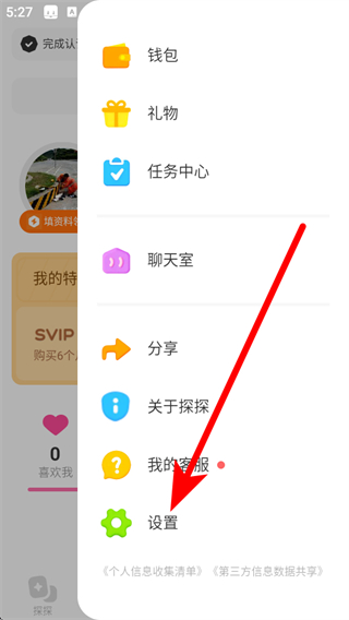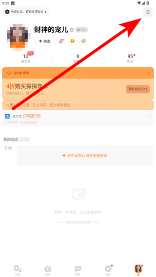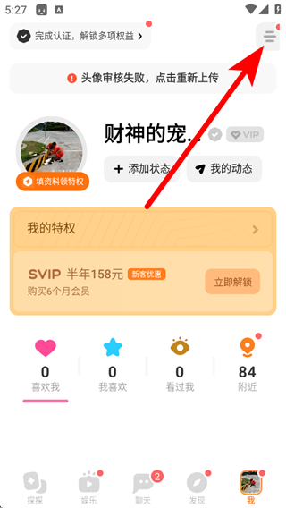 1.打開探探APP,點(diǎn)擊右上角的三條橫線菜單按鈕。