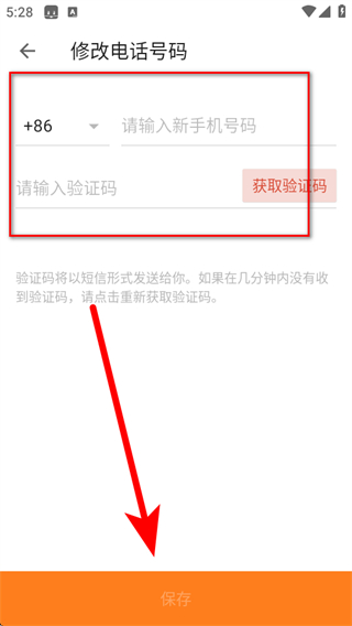 5.進(jìn)入修改電話號(hào)碼界面,輸入新手機(jī)號(hào)碼和驗(yàn)證碼,點(diǎn)擊保存按鈕即可完成手機(jī)號(hào)綁定修改。