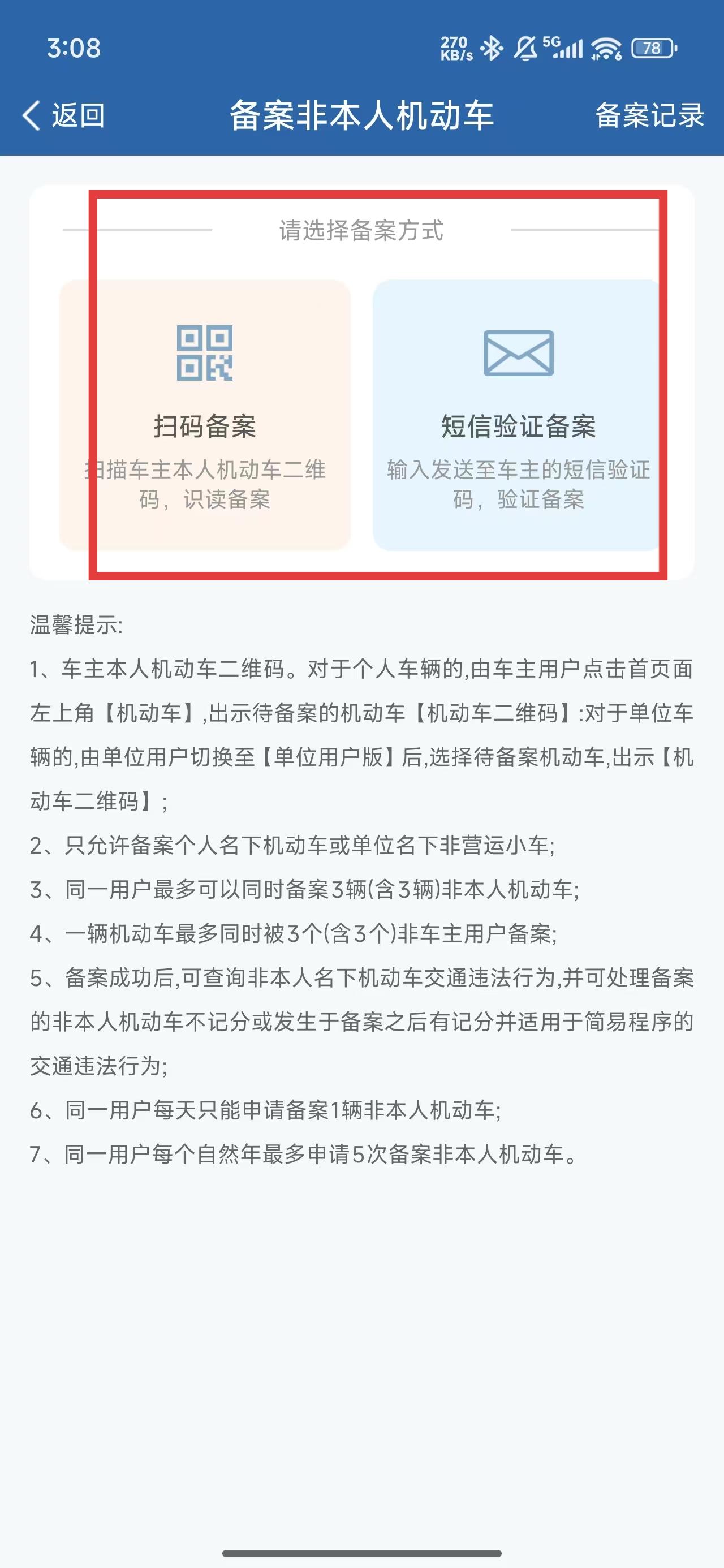 4、在跳轉(zhuǎn)到備案非本人機(jī)動車頁面后,可以任意選擇下方兩種方法進(jìn)行備案。