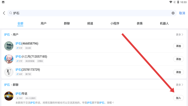 3、在搜索完詞條后,在下面找到對應(yīng)的群聊點擊加入按鈕,即可進入群聊。