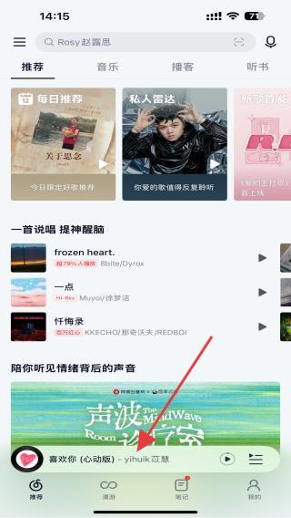 1、啟動(dòng)APP進(jìn)入到首頁(yè)內(nèi),點(diǎn)擊正在播放的音樂(lè)。