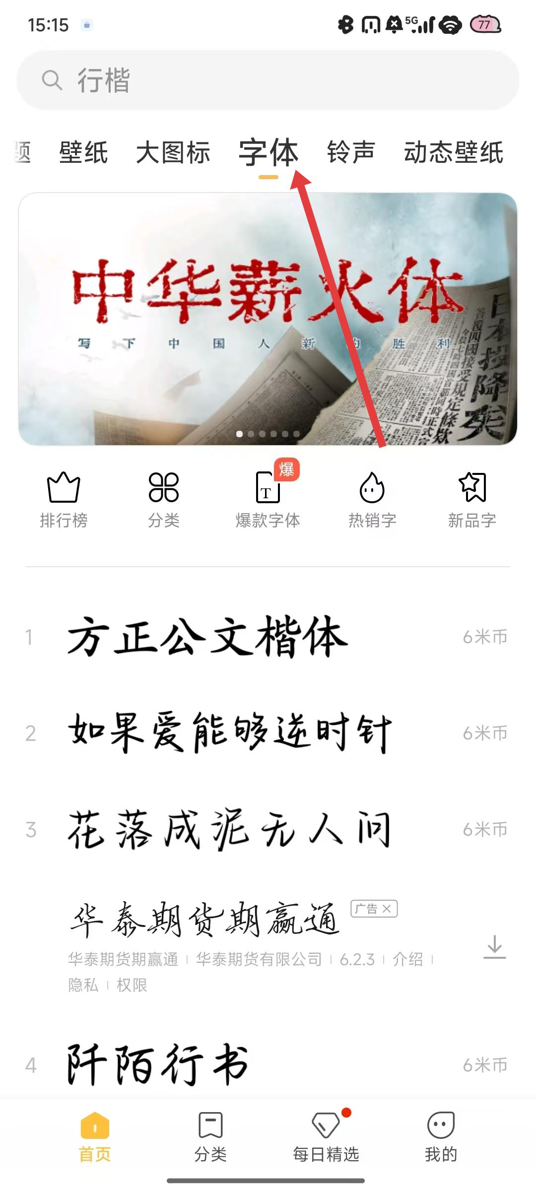1、打開小米手機(jī)的主題壁紙應(yīng)用,點(diǎn)擊頂部導(dǎo)航欄中的字體選項(xiàng),進(jìn)入字體選擇頁(yè)面。
