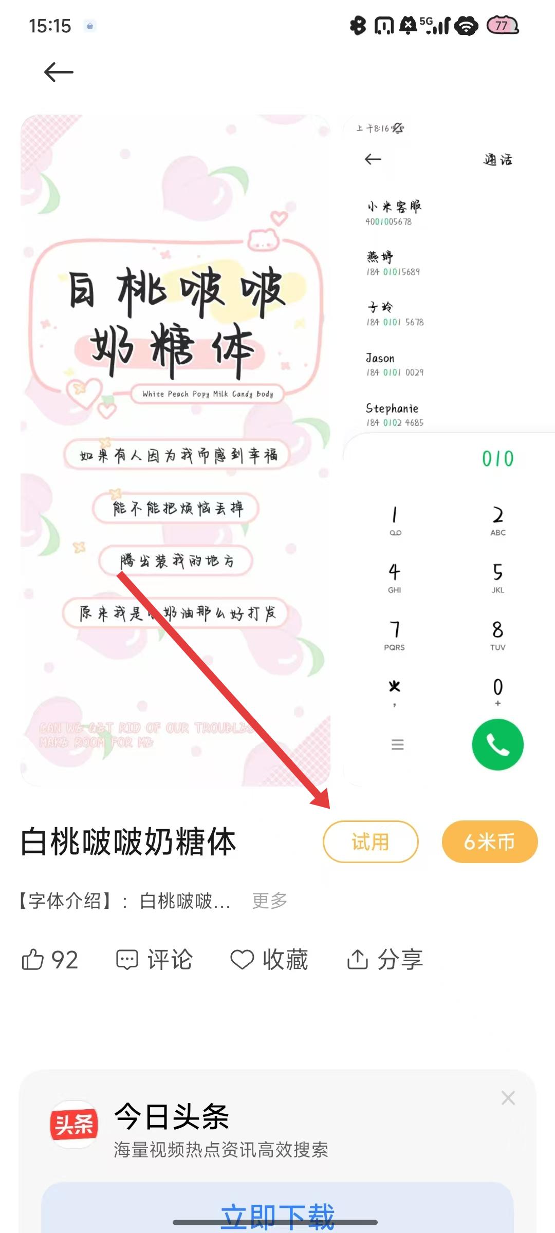 3、點(diǎn)擊進(jìn)入目標(biāo)字體的詳情頁(yè)面,若想先體驗(yàn)可點(diǎn)擊試用按鈕;若要購(gòu)買使用,點(diǎn)擊價(jià)格對(duì)應(yīng)的按鈕,按提示完成操作后即可應(yīng)用該字體樣式。