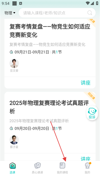 1、打開(kāi)質(zhì)心在線APP,在底部導(dǎo)航欄中點(diǎn)擊我的課程選項(xiàng)。