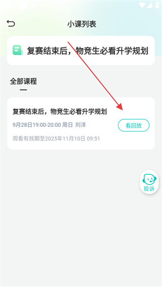 3、進(jìn)入課程詳情頁(yè)面后,找到對(duì)應(yīng)課程章節(jié),點(diǎn)擊看回放按鈕。