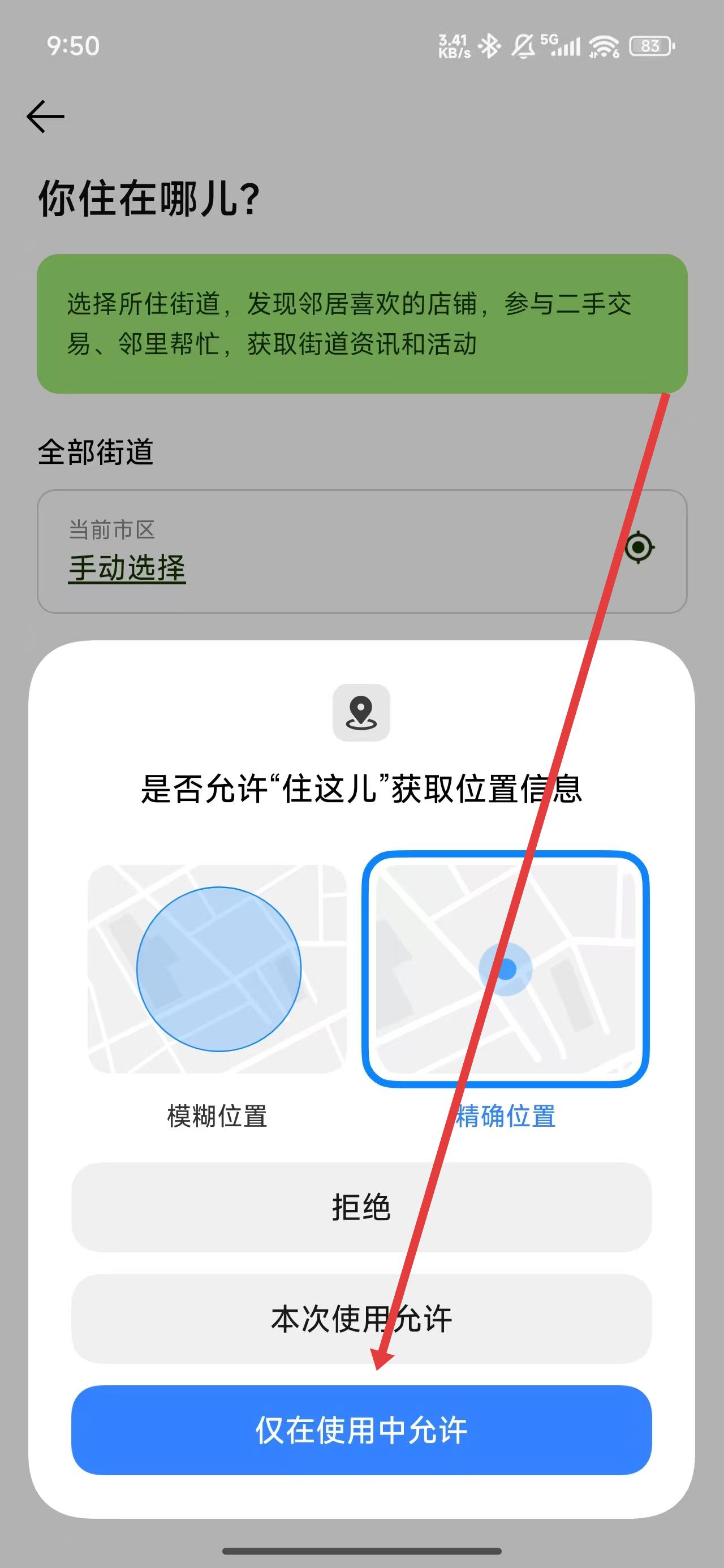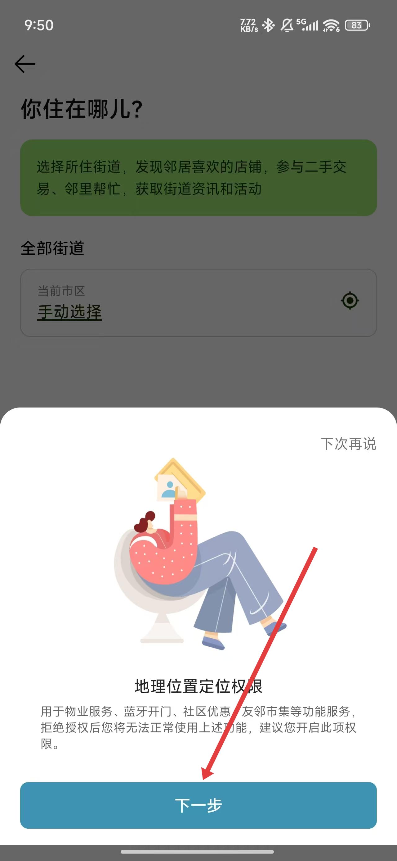 1、在進(jìn)入到住這兒app后,在地理位置定位權(quán)限窗口點擊下一步按鈕,開啟定位操作。