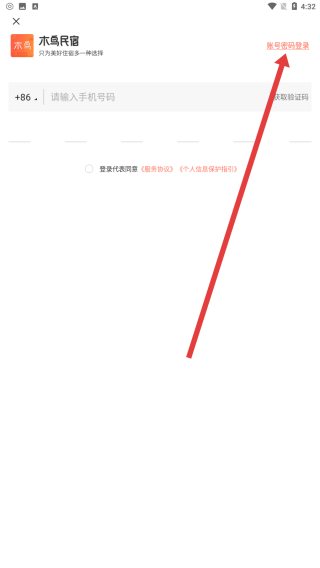 1、在木鳥民宿登錄界面中,點擊右上角的賬號密碼登錄,更改登錄方式。