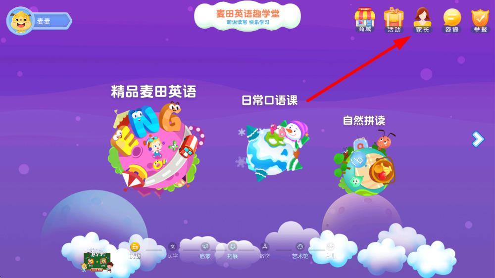 1、打開(kāi)麥田英語(yǔ)app,在主界面點(diǎn)擊右上方的家長(zhǎng)圖標(biāo),進(jìn)入家長(zhǎng)操作頁(yè)面。