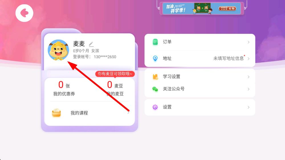2、在家長(zhǎng)頁(yè)面,點(diǎn)擊頭像下方的賬號(hào)信息區(qū)域,進(jìn)入我的帳號(hào)頁(yè)面。