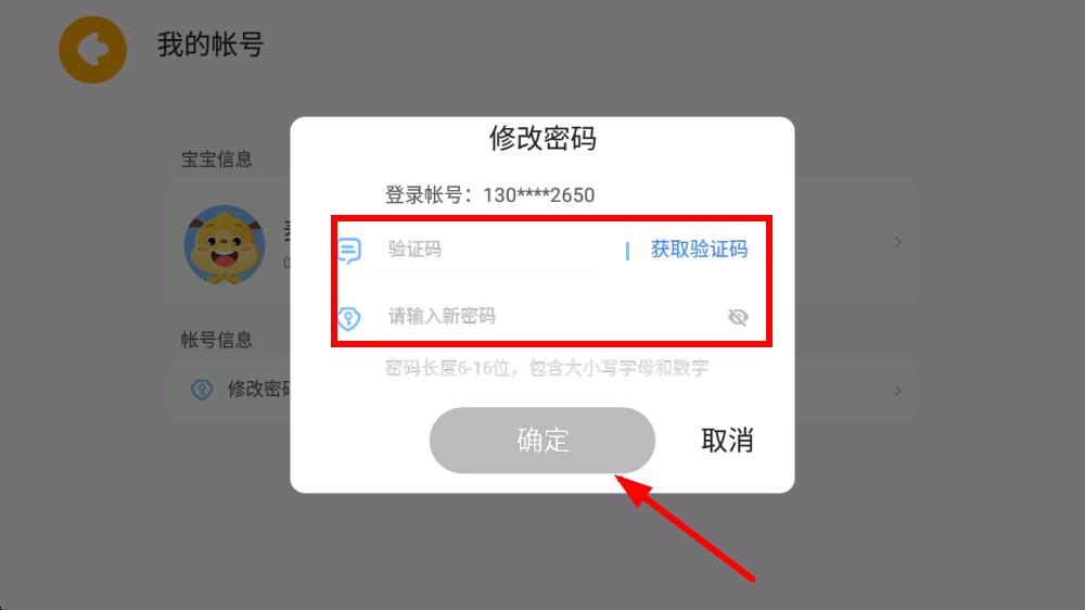 4、在彈出的修改密碼窗口中,點(diǎn)擊獲取驗(yàn)證碼,輸入收到的驗(yàn)證碼,并設(shè)置新密碼,最后點(diǎn)擊確定按鈕,完成密碼修改。