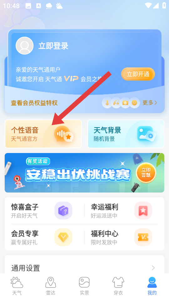 1、打開天氣通APP,切換至底部導(dǎo)航欄的我的頁面,點(diǎn)擊個(gè)性語音選項(xiàng),進(jìn)入語音選擇界面。