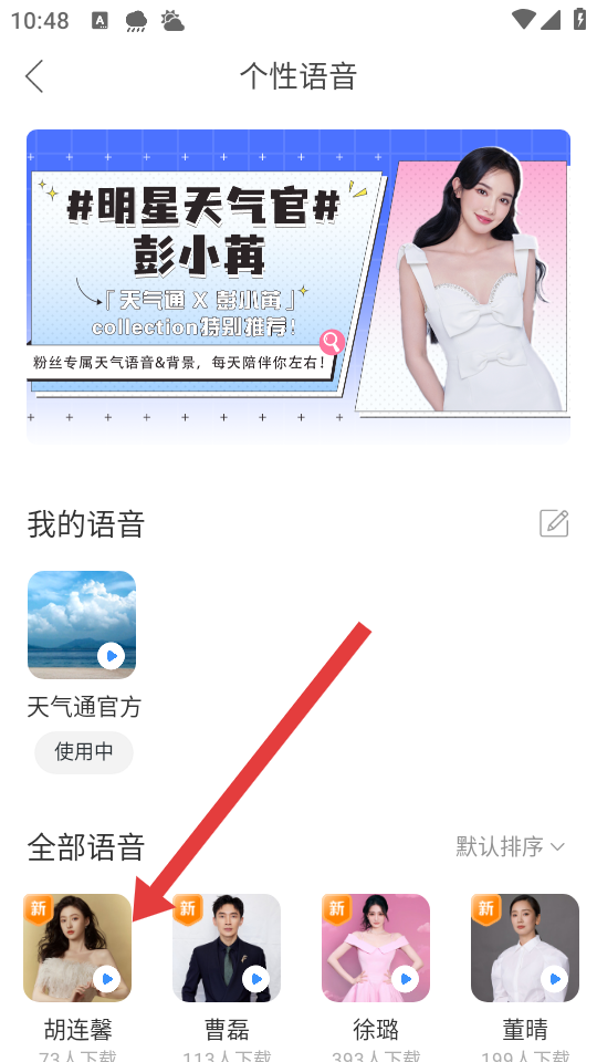 2、在個(gè)性語音頁面中,選擇喜歡的語音包如胡連馨等明星語音或天氣通官方語音,并點(diǎn)擊設(shè)置為當(dāng)前語音。