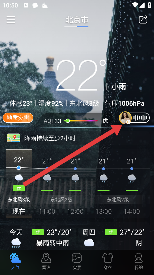 3、返回天氣的頁面點(diǎn)擊語音播報(bào)的圖標(biāo),觸發(fā)即時(shí)播報(bào)并確保自動(dòng)播報(bào)已啟用。