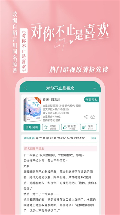 晉江文學(xué)城app海量圖書下載,最新最熱完結(jié)好書,離線書城,免費下載觀看,玄幻、修真、文學(xué)、治愈,武俠、官場,穿越、歷史、架空、都市言情、種田、總裁、女強、高干、文學(xué)、治愈,懸疑,犯罪……你想要看的這里都有,小公舉們點進來!晉江小說閱讀是晉江文學(xué)城為愛小說的你傾力打造的可“看”、可“聽”、可評論的小說閱讀器!海量時下最新最熱小說、傳說中的殿堂級經(jīng)典神作,盡在晉江小說閱讀!