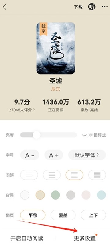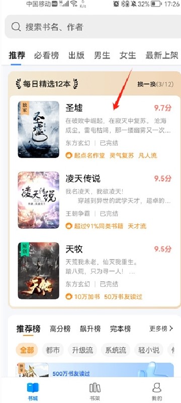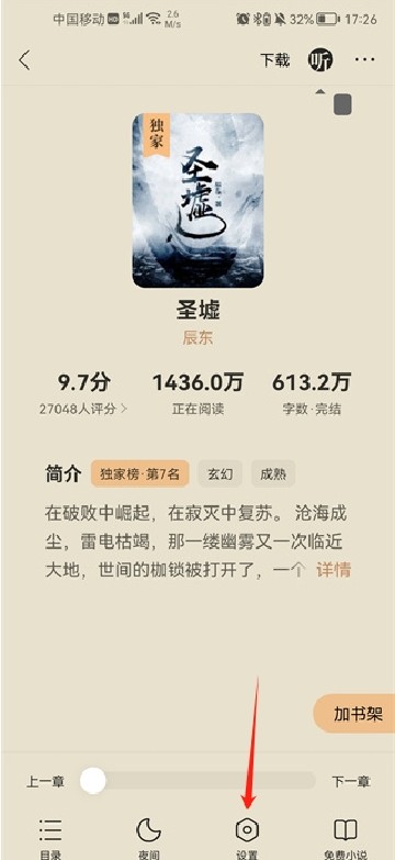 1、打開搜狗閱讀應(yīng)用,在書城界面找到想閱讀的小說,比如點(diǎn)擊圣墟進(jìn)入閱讀界面。
