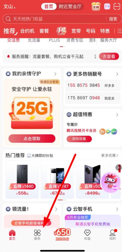 1、打開(kāi)10010聯(lián)通網(wǎng)上營(yíng)業(yè)廳APP,點(diǎn)擊底部導(dǎo)航欄中的服務(wù)。