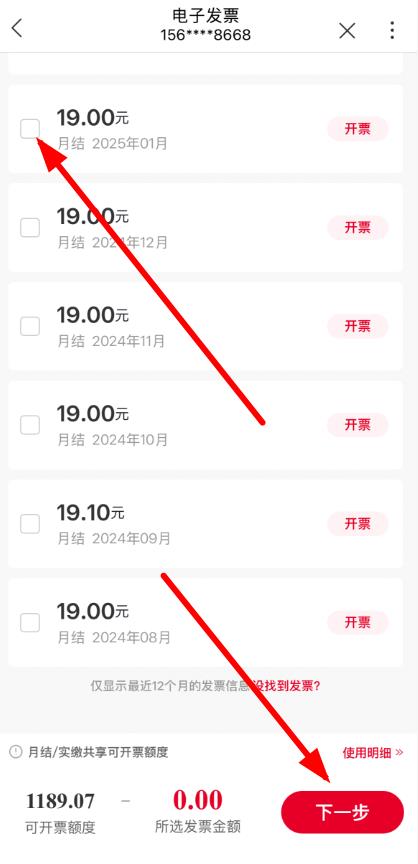 3、在電子發(fā)票頁(yè)面,勾選需要開(kāi)票的月份金額,點(diǎn)擊下一步,然后根據(jù)提示完成開(kāi)票操作。
