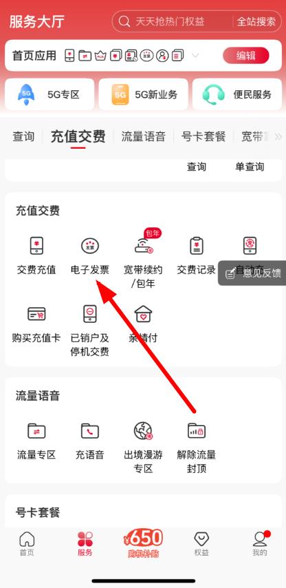 2、在服務(wù)大廳頁(yè)面,點(diǎn)擊充值交費(fèi)分類(lèi)下的電子發(fā)票選項(xiàng)。