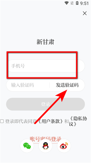 3、在賬號登錄注冊頁面,輸入手機(jī)號后點擊發(fā)送驗證碼。