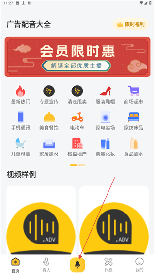1、打開廣告配音大全APP,進入首頁內點擊下方麥克風的圖標。