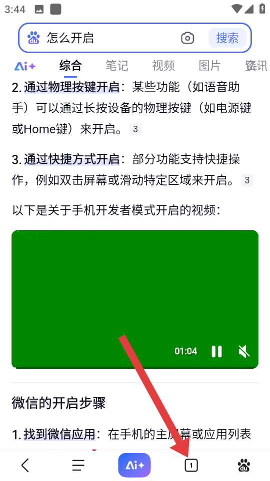 1、打開百度APP,點(diǎn)擊底部導(dǎo)航欄右側(cè)的標(biāo)簽頁圖標(biāo),顯示窗口數(shù)字1的方形圖標(biāo),進(jìn)入標(biāo)簽頁管理界面。