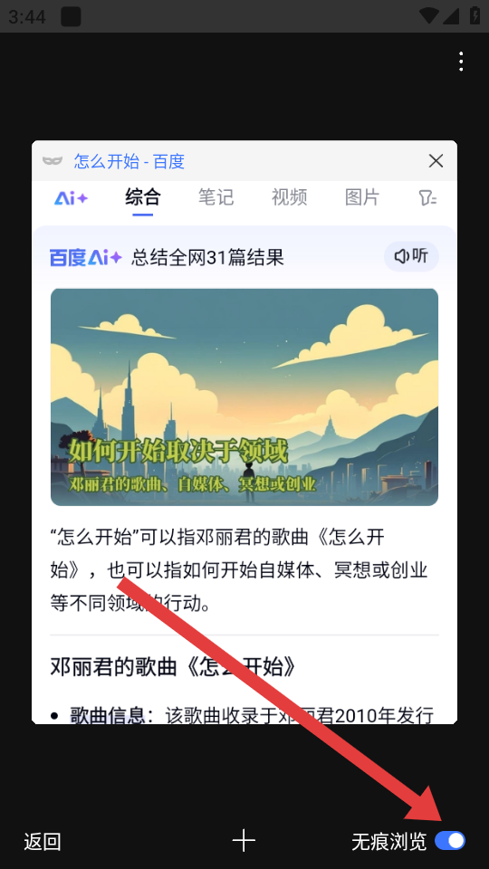 2、在標(biāo)簽頁管理界面,找到右下角的無痕瀏覽開關(guān),若為開啟狀態(tài),開關(guān)呈藍(lán)色,點(diǎn)擊關(guān)閉該開關(guān)。