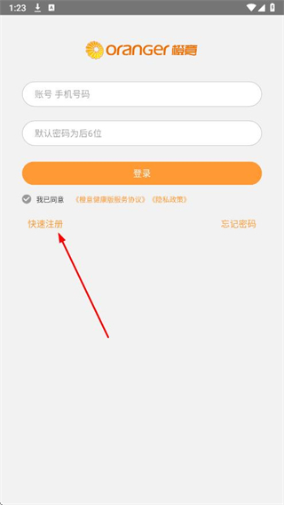 1、打開橙意健康app,在登錄界面點(diǎn)擊快速注冊(cè)選項(xiàng)。