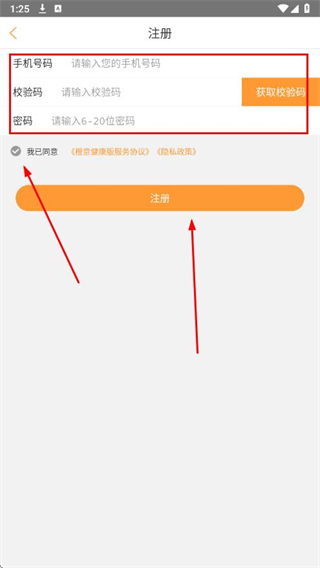 2、輸入手機(jī)號(hào)碼、校驗(yàn)碼,設(shè)置密碼,勾選同意服務(wù)協(xié)議和隱私政策,點(diǎn)擊注冊(cè)。
