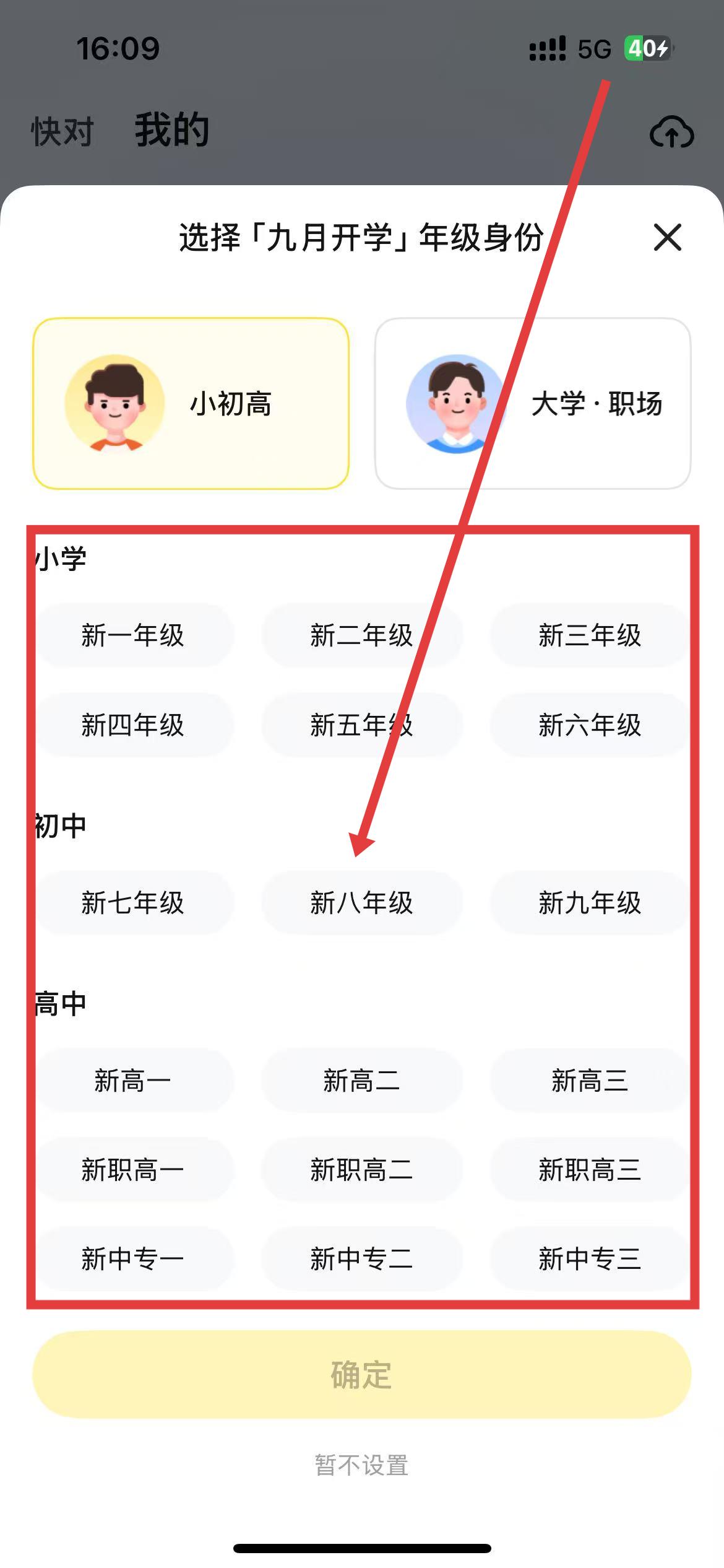 2、進(jìn)入年級選擇頁面后,在年級選擇界面,按實(shí)際情況選小學(xué)、初中、高中等具體年級。