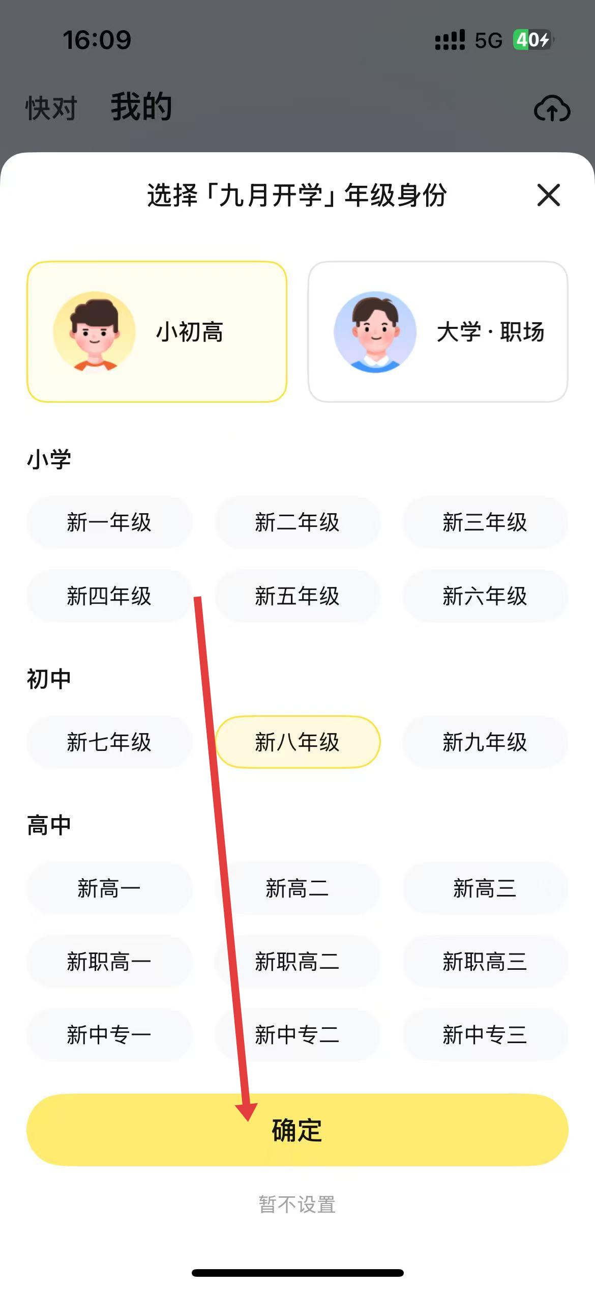 3、選擇好年級并確認(rèn)無誤之后,點(diǎn)擊底部黃色的確定按鍵,完成年級更改操作。