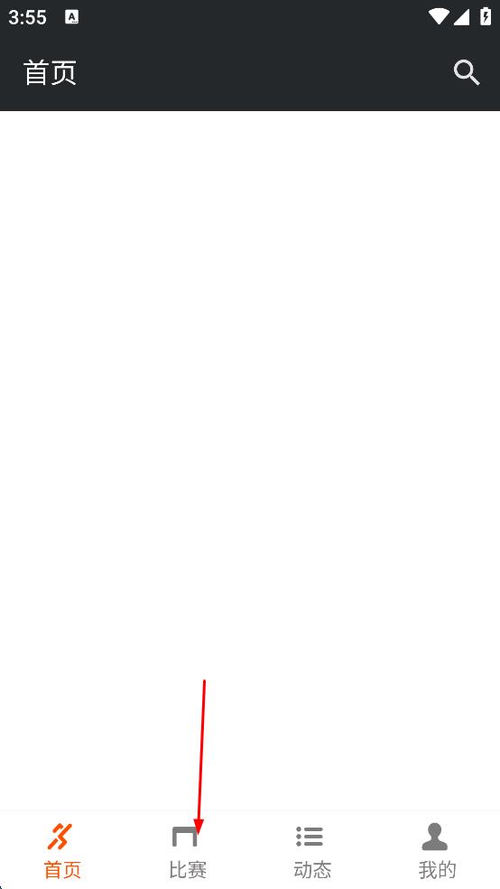 3、登錄后進入首頁,底部有“首頁”“比賽”“動態(tài)”“我的”選項,點擊“比賽”選項,即可查看各類運動比賽相關內容 。