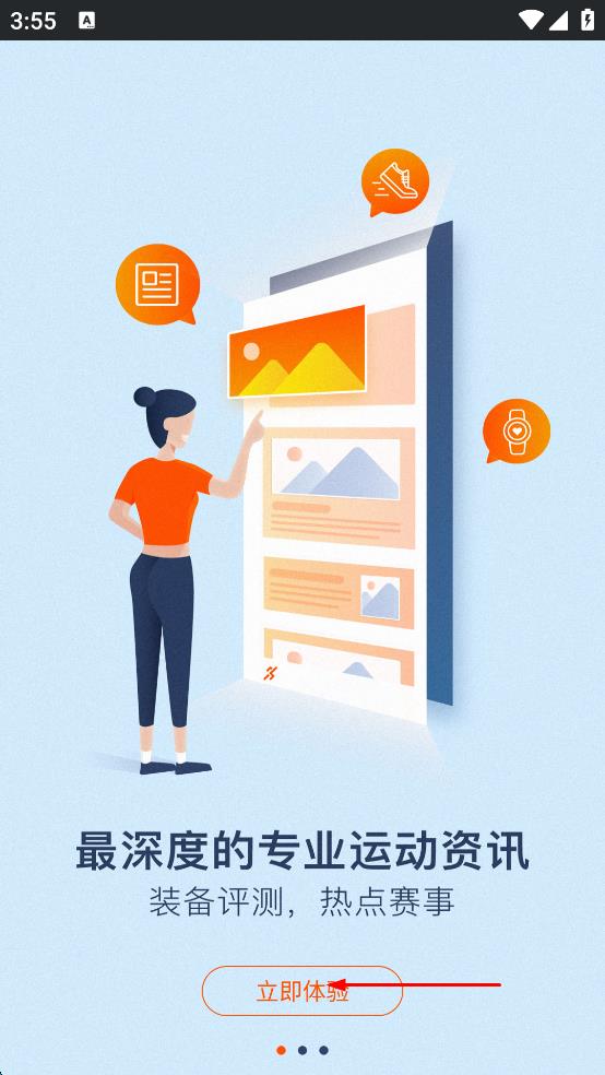 1、進入軟件引導頁,看到“最深度的專業(yè)運動資訊 裝備評測,熱點賽事”介紹,點擊“立即體驗”按鈕,進入登錄注冊環(huán)節(jié)。