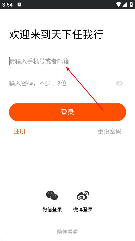 2、在“歡迎來到天下任我行”頁面,選擇輸入手機號或郵箱,接著輸入不少于8位的密碼,也可點擊微信、微博圖標進行第三方登錄,完成登錄操作。