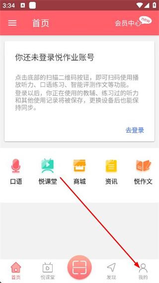 1、打開悅作業(yè)app,點擊底部導(dǎo)航欄中的我的選項。