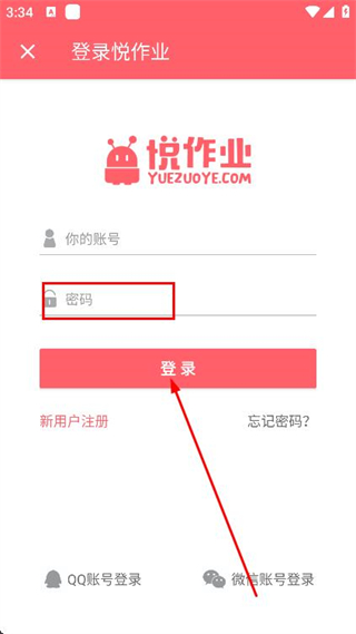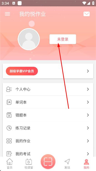 2、在“我的悅作業(yè)”頁面中,點擊上方的未登錄按鈕。