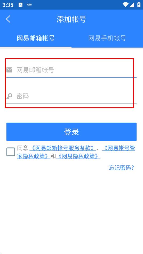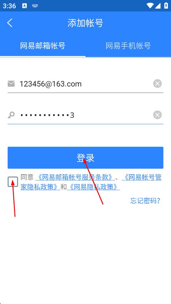 4、輸入郵箱帳號和密碼后,勾選“同意網(wǎng)易郵箱帳號服務(wù)條款、網(wǎng)易帳號管家隱私政策和網(wǎng)易隱私政策,點擊“登錄”按鈕,完成賬號添加操作。