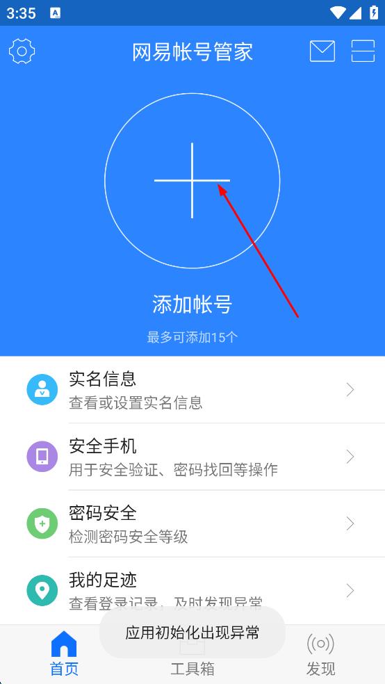 2、進(jìn)入網(wǎng)易帳號管家主界面,界面有“添加帳號”功能,還有“實名信息”“安全手機(jī)”“密碼安全”等選項,點擊“添加帳號”。