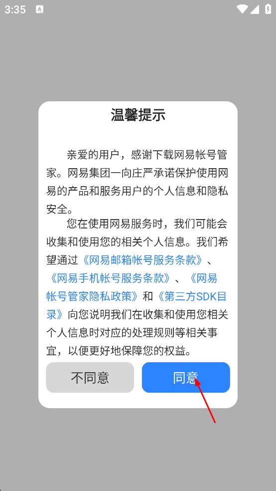 1、打開網(wǎng)易帳號管家,進(jìn)入溫馨提示界面,界面說明網(wǎng)易集團(tuán)承諾保護(hù)用戶個人信息和隱私安全,需通過相關(guān)條款和政策說明信息收集使用規(guī)則,點擊“同意”按鈕。