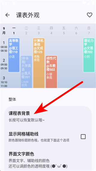 4、在課表外觀頁面,找到課程表背景,按提示進(jìn)行背景更換操作。