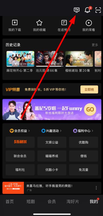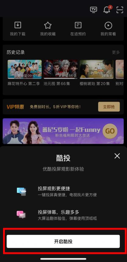 2、在個(gè)人頁(yè)面,點(diǎn)擊右上方TV投屏圖標(biāo),進(jìn)入投屏功能界面。