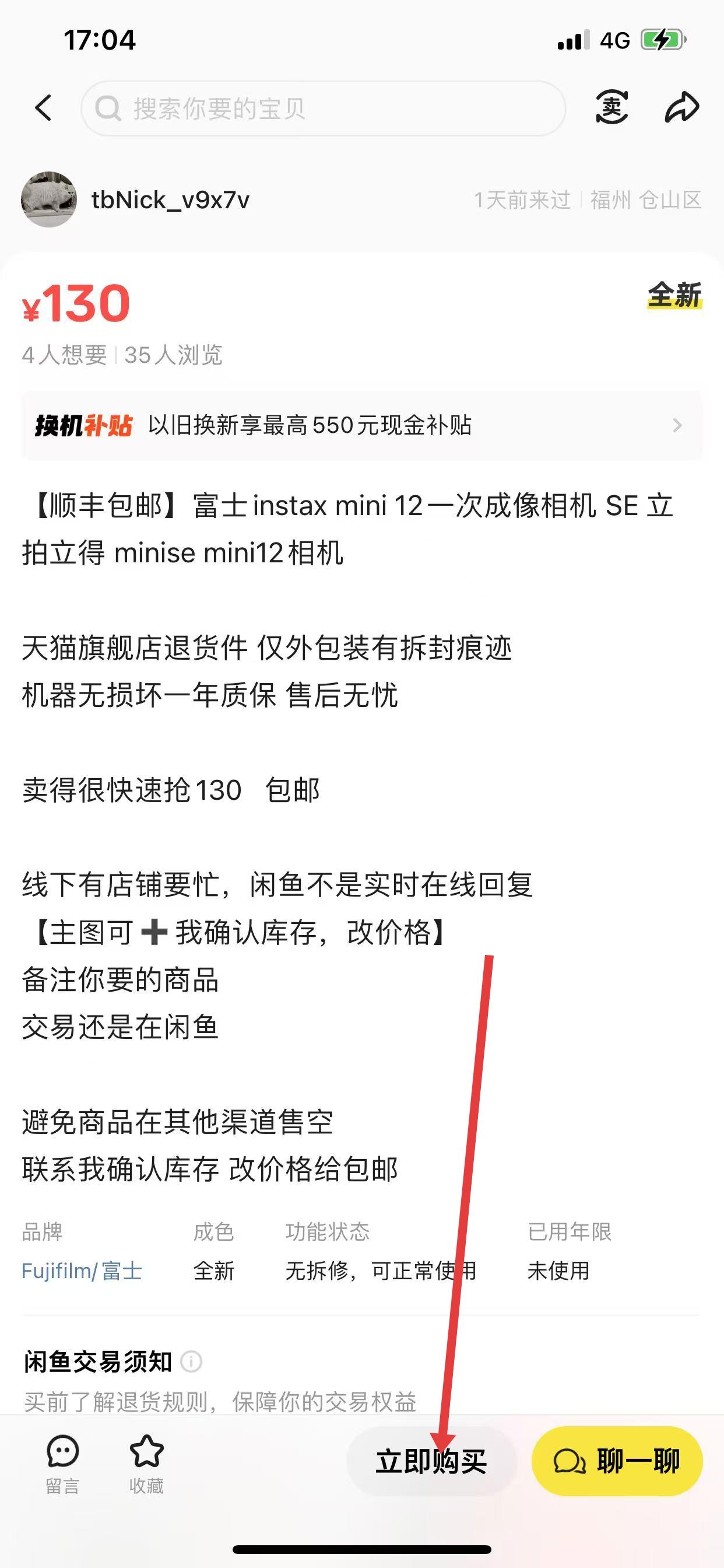 2、在商品詳情頁中,確認(rèn)商品信息無誤后,點(diǎn)擊底部的立即購買按鈕。