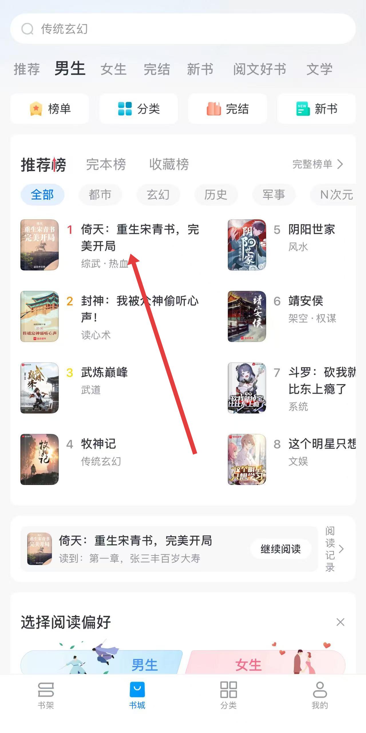 1、打開淘小說App,進(jìn)入書城界面,在推薦榜等榜單中選擇想看的小說,比如點(diǎn)擊倚天:重生宋青書,完美開局。