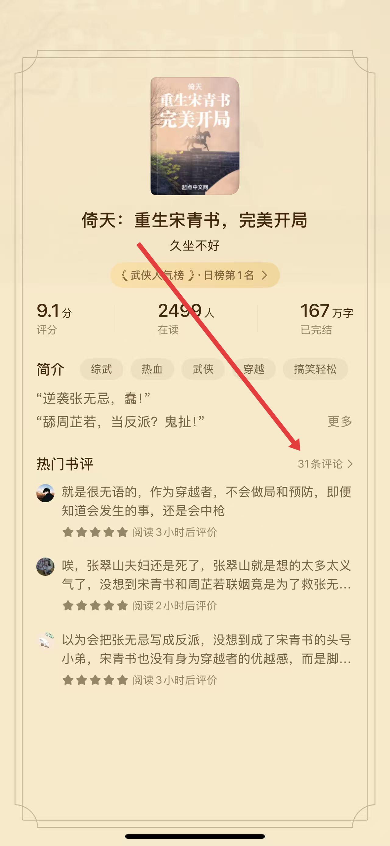 2、進(jìn)入小說詳情頁面后,下滑找到熱門書評板塊,點(diǎn)擊右側(cè)xx條評論的選項(xiàng),就能進(jìn)入該小說評論區(qū)。