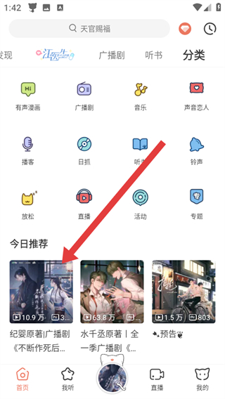 1、打開貓耳FM,在首頁選擇自己想要下載的音頻并點(diǎn)擊進(jìn)入播放界面。