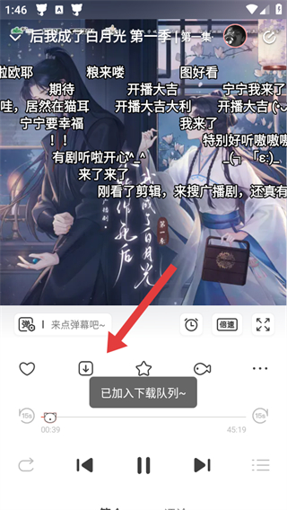 2、在音頻播放的界面,點(diǎn)擊下載的圖標(biāo),會(huì)彈出已加入下載隊(duì)列的提示,音頻開始下載。