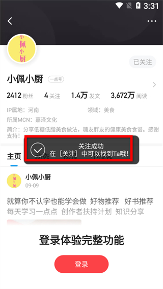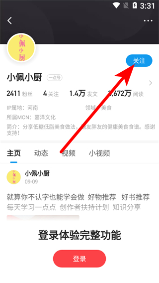 3、在創(chuàng)作者個人主頁,點擊關注按鈕,即可完成關注操作。