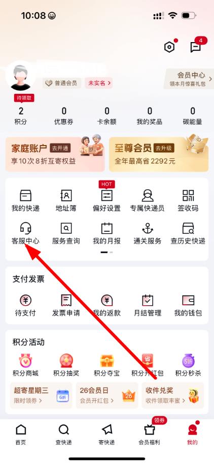 1、打開順豐速運App,點擊底部導(dǎo)航欄的我的,進入個人中心頁面,點擊客服中心。